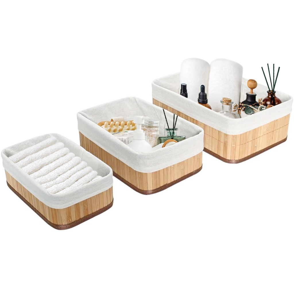 Jogo de 03 Cestos Organizadores Feito de Bambu Cor Claro. Perfeito Para Banheiros, Armários, Lavanderias, Entre Outros. Bonito e Elegante (Bege - Pequeno)