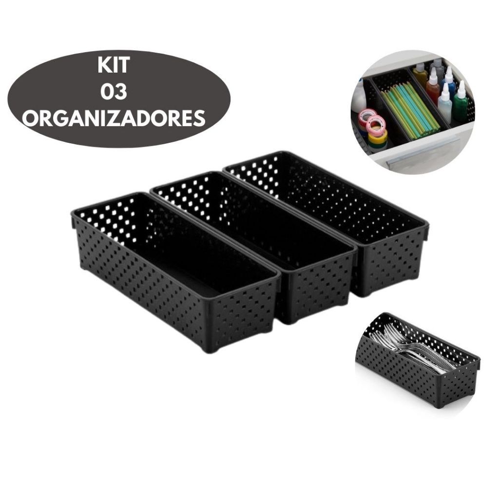 Conjunto C/ 3 Organizadores De Gaveta Multiuso Preto Talheres Faqueiro Papelaria Furadinho Retangular Kit Jogo Cozinha