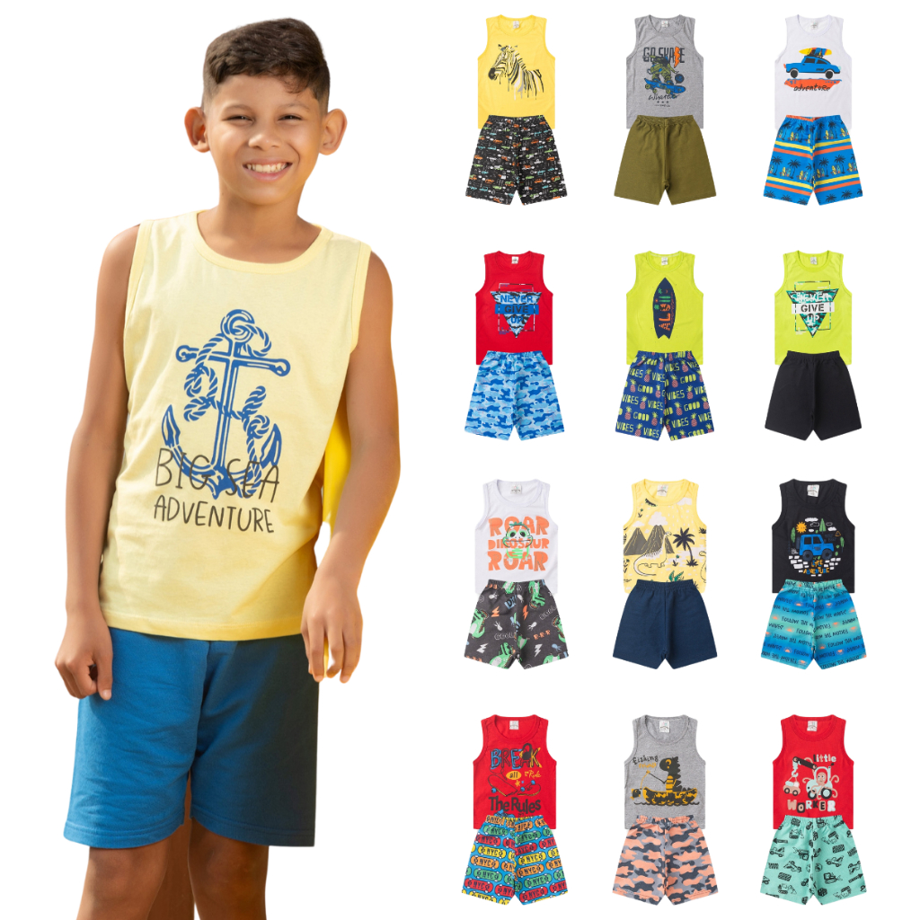 Kit 10 Peças 5 Regatas e 5 Bermudas Regata Estampada Conjunto Infantil Menino Bermuda Tamanho 1 á14