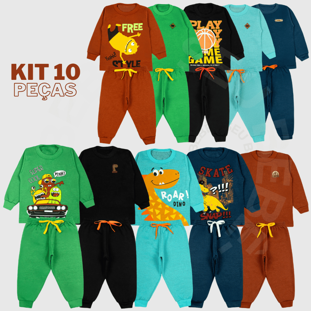 Kit 10 Peças Conjunto Inverno Infantil Estampas Diversas e Lisa Menino de 1 a 8 anos (5 Casacos + 5 Calças)