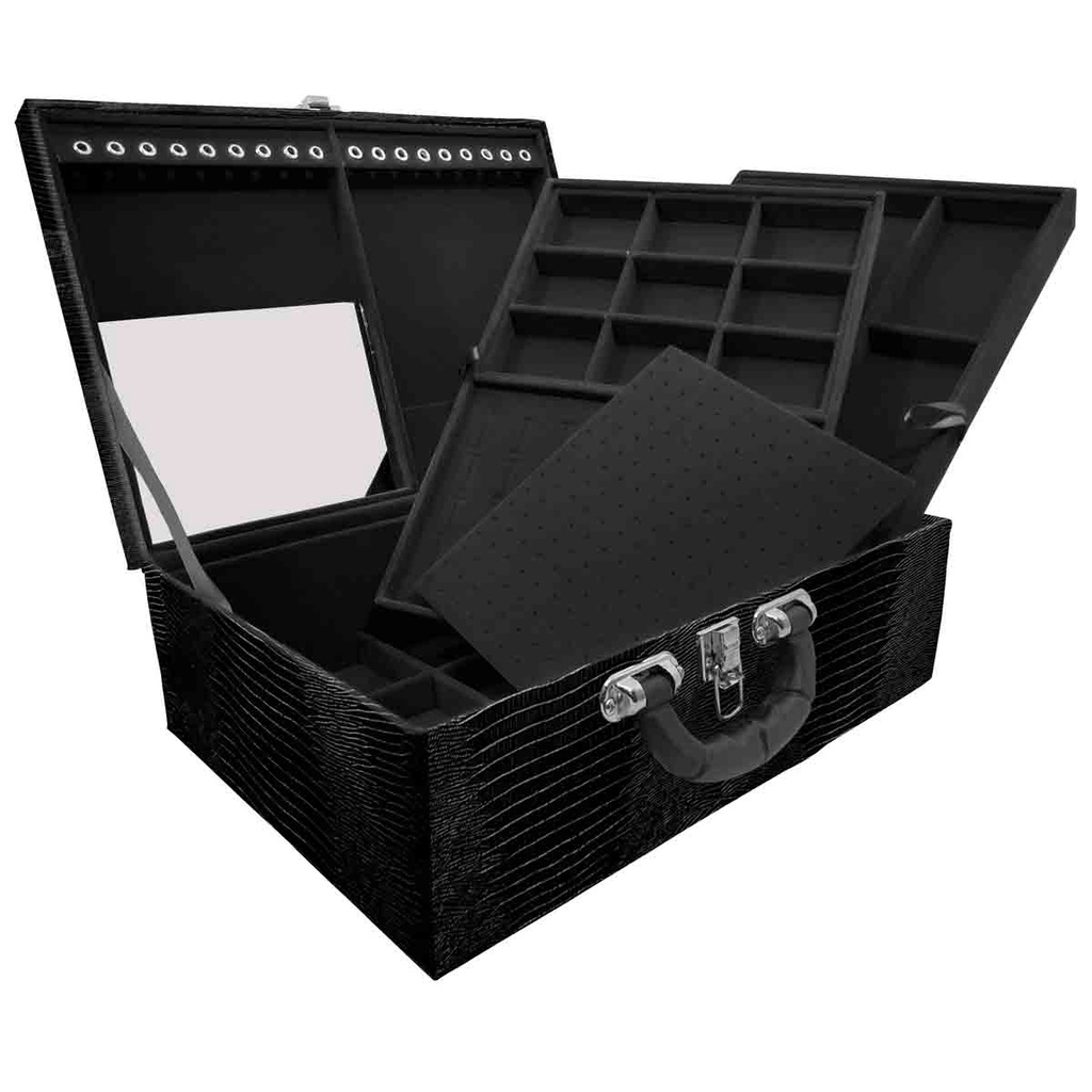 Estojo Maleta Porta Jóias Duplo Grande Jacaré Com Alça Preta e Espelho