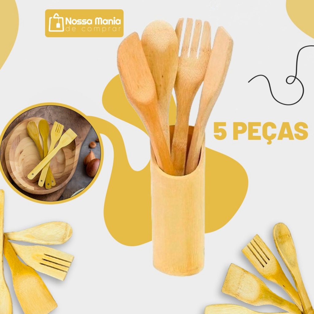 Kit Conjunto 5 Peças Utensílios Bambu Resistente Multiuso Casa Cozinha Decoração Com Suporte de Bambu