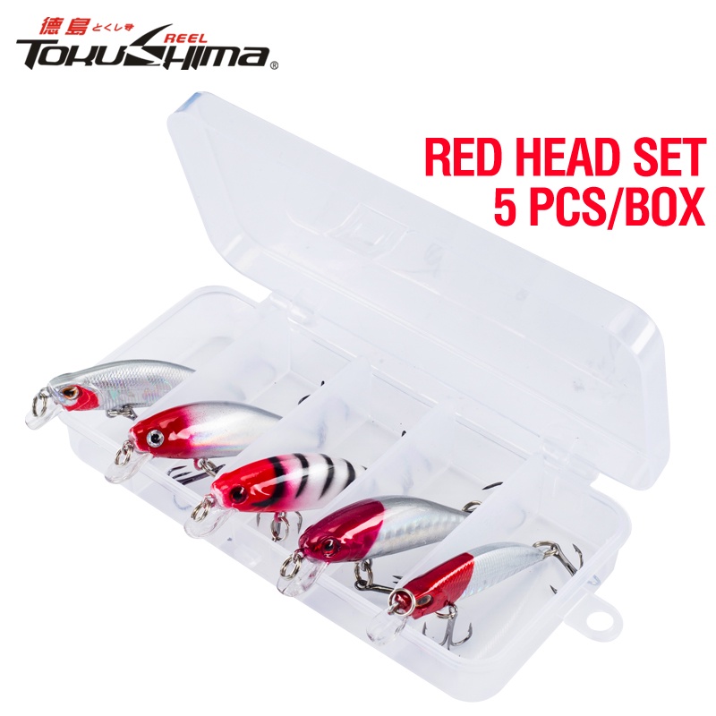 5cm/5.5cm 5PCS/BOX Conjunto De Cabeça Vermelha Isca De Fundição Dura De Plástico Peixinho Afundando 5g/6.5g Pesca Giratória 5 Cores Comolife Pele Buzz