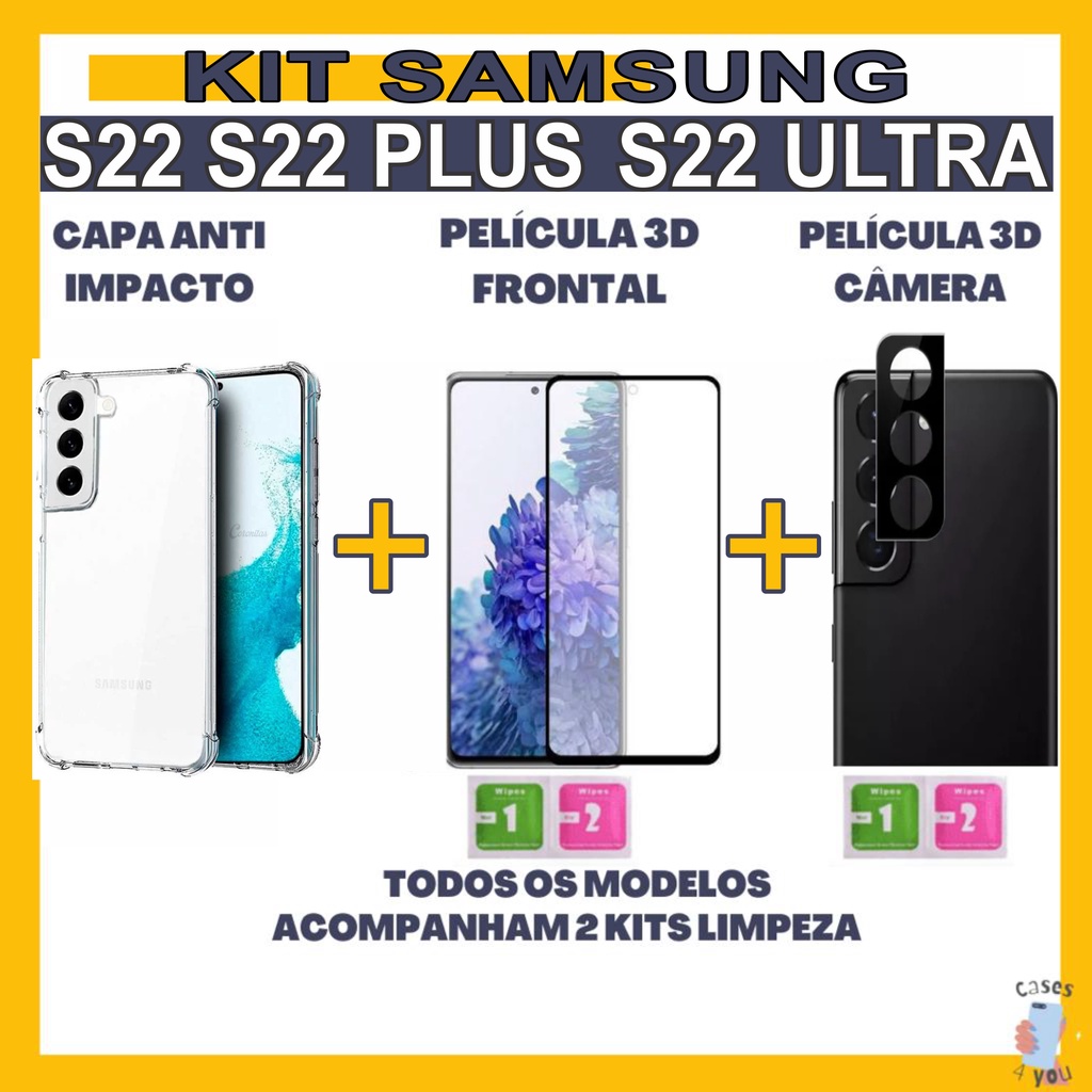 Kit Samsung Galaxy S22 S22Plus S22Ultra Capa Anti Impacto Película Frontal 3D Película Câmera 3D Protetora da Lente S22 S22 Plus S22 Ultra