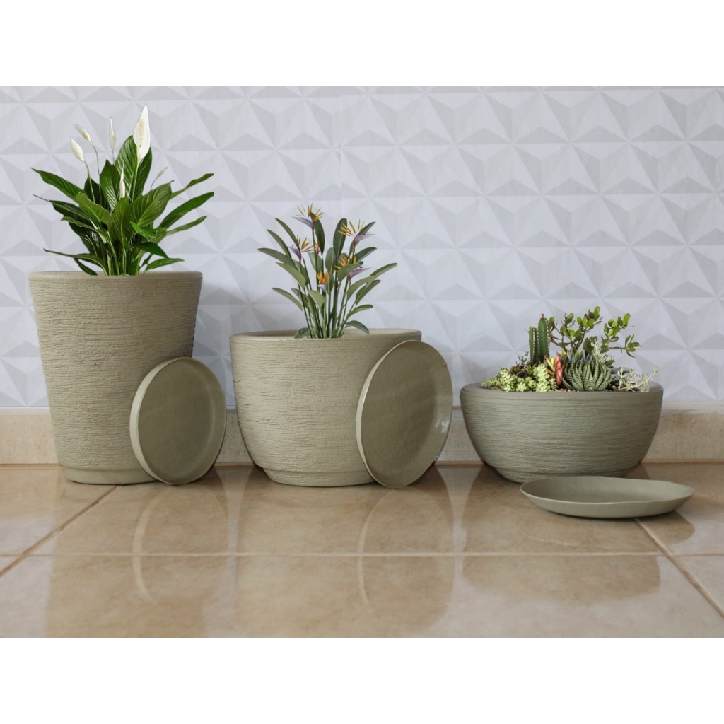 Kit Com 3 Vasos Decorativo de Planta Escovado Polietileno Com Prato Cone + Bojo + Bacia