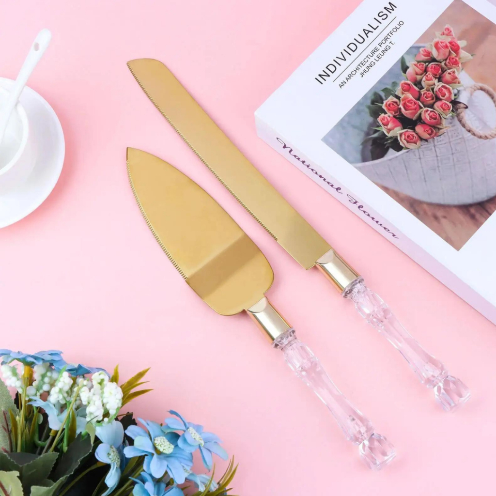 Kit Faca Espátula Bolo Pães Torta Aço Inox Dourado Cabo Acrílico Para Servir MIMI