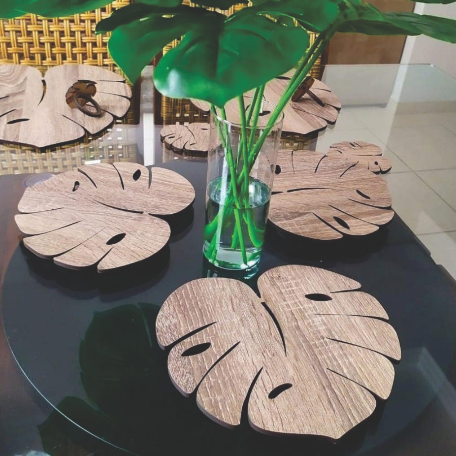 Trio suporte para panela, descanso de panela e pratos, formato folha, corte a laser em MDF madeira laminado 6 mm.