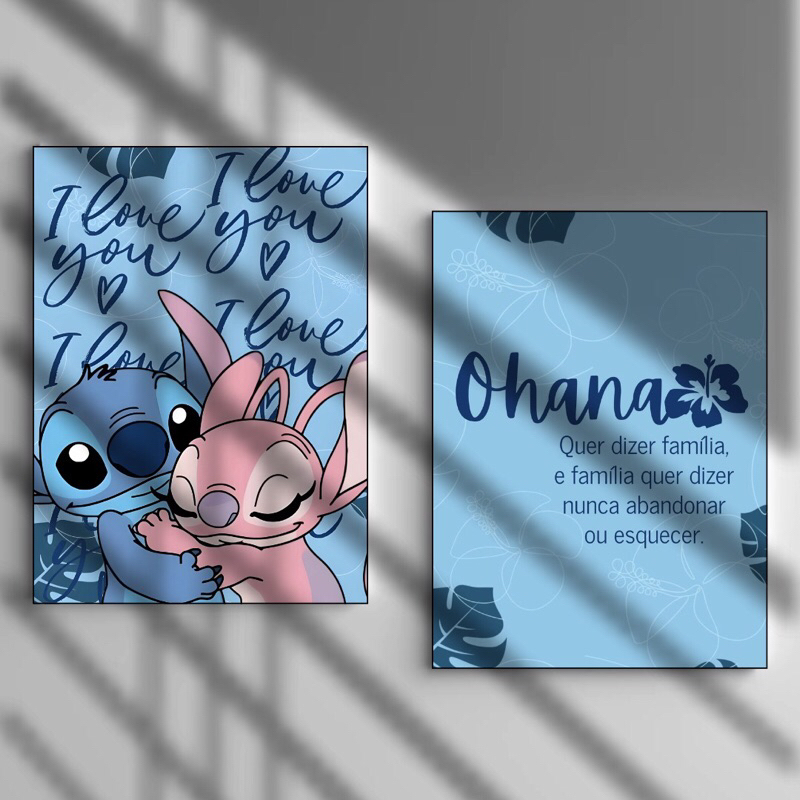 Kit 2 Quadros 20x28 ou 21x30 Decorativo Ohana Quer Dizer Família Tons De Azul Para Quarto, Sala, Cozinha MDF Stitch