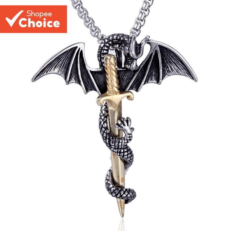 Colar Masculino Vintage De Aço Inoxidável 316L Gótico Pterosaur Dragão Espada Cruz Pingente Motociclista Punk
