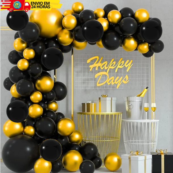 Kit 75 Balões Latex Preto + Dourado Cromado Metalizado Para Festas e Aniversário
