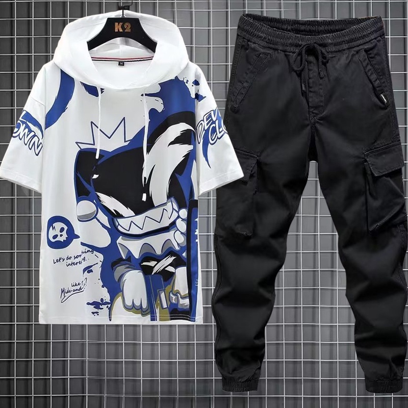 Calças De Carga Masculinas Estilo Hip Hop Joggers + Conjunto De Homens Com Capuzes Casuais Camisetas De Manga Curta Vestuário Masculino De Verão