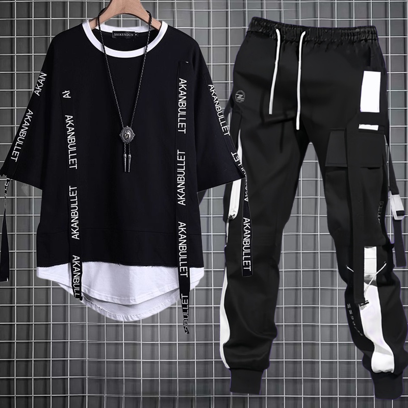 Ternos Masculinos Hip Hop Streetwear Calças De Carga + Moda Casual Camiseta Manga Curta Conjunto Masculino