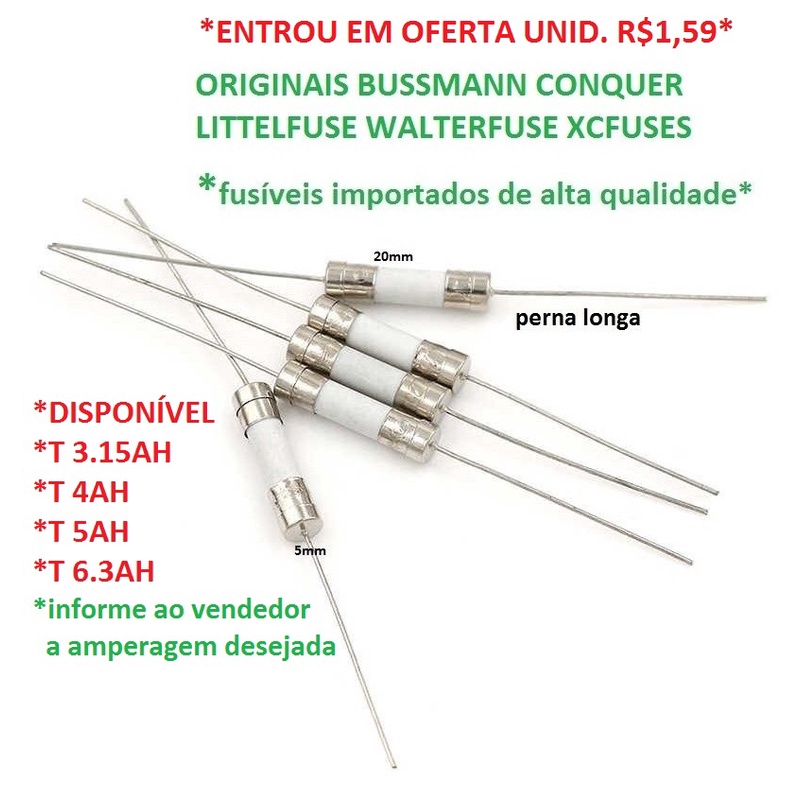10 Pçs Fusível Cerâmico Axial 250v 5*20mm Perna Longa / Entrou Em Oferta** Unidade R$ 1,59