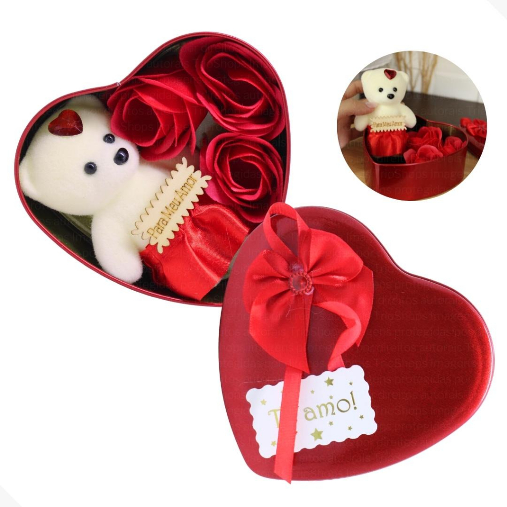 Caixa Coração de metal Com Ursinho e Rosas presente namorada esposa amiga mãe