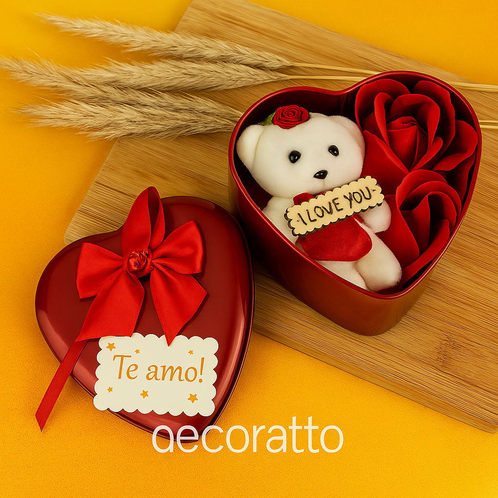 Caixa de Presente Coração Metal com Ursinho e Rosas Dia das Mães Namorados