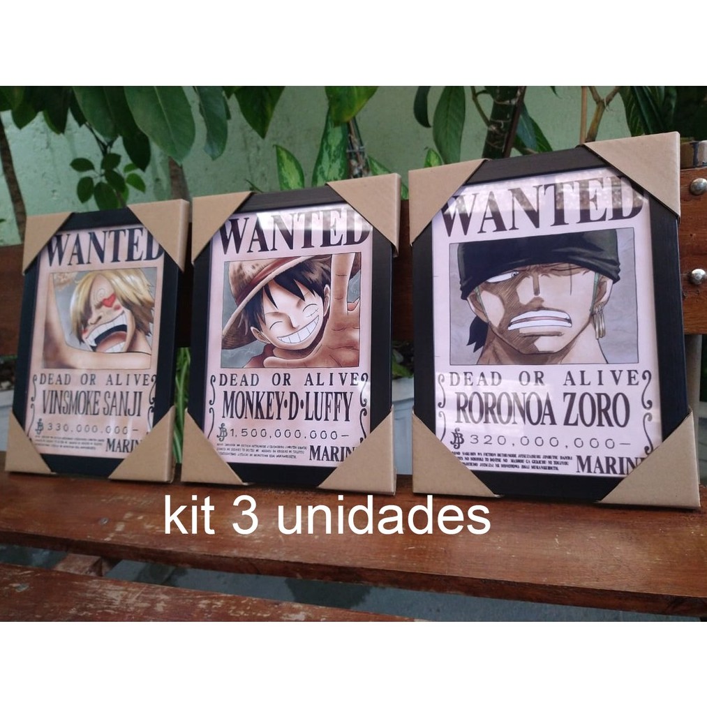 Kit 3 Quadros Decorativos One Piece Placas Decorativas Recompensa Anime Wanted Tamanho 19X29 Coleção Exclusiva Já Acompanha Dupla Face
