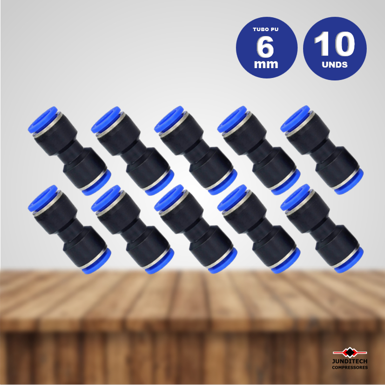 Kit com 10 Unidades Conexão Pneumática Reta Emenda Tubo PU 6 mm União Mangueira Conector Rápido