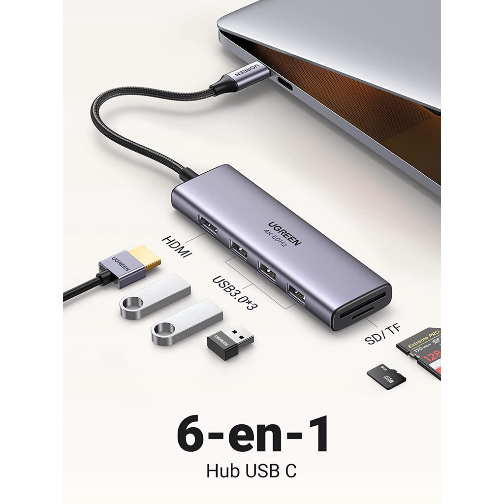 Adaptador UGREEN Hub USB C ( 6 em 1 ) Thunderbolt 3/4 - HDMI 4K 60Hz - Tipo C PD 100W Carregamento - USB 3.0 2 portas - leitor de cartão SD TF - compatível Macbook Air Pro M1 M2 Max iPad Galaxy Dex Tab S23 S23+ S23 Ultra S22 S21 DELL XPS ASUS ZenBook