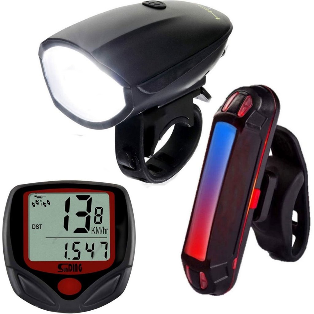 Kit de Acessórios para bicicleta Velocímetro com fio + Farol Lanterna Bike 3 Focos Led + lanterna Traseira Recarregável