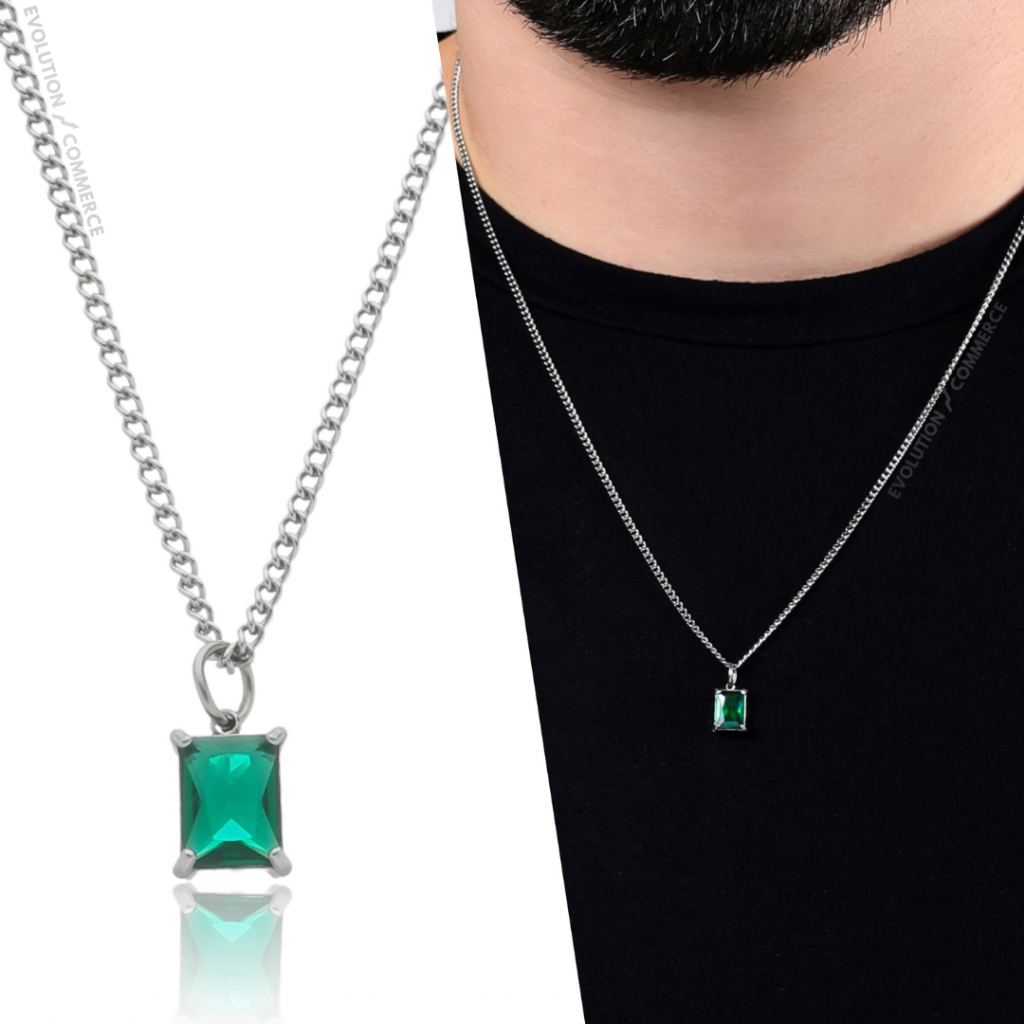 Colar Masculino Corrente com Pingente Zirconia Strass Verde Pedra Aço Inoxidável Não Fica Preto Correntinha Cordão Pode Molhar Antialérgico