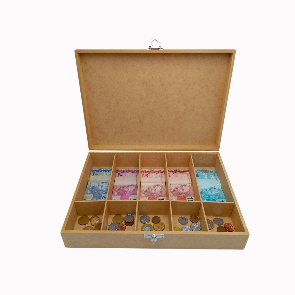 Caixa Dinheiro Porta Moedas e Cédulas Com Fecho Mdf Caixa Organizadora