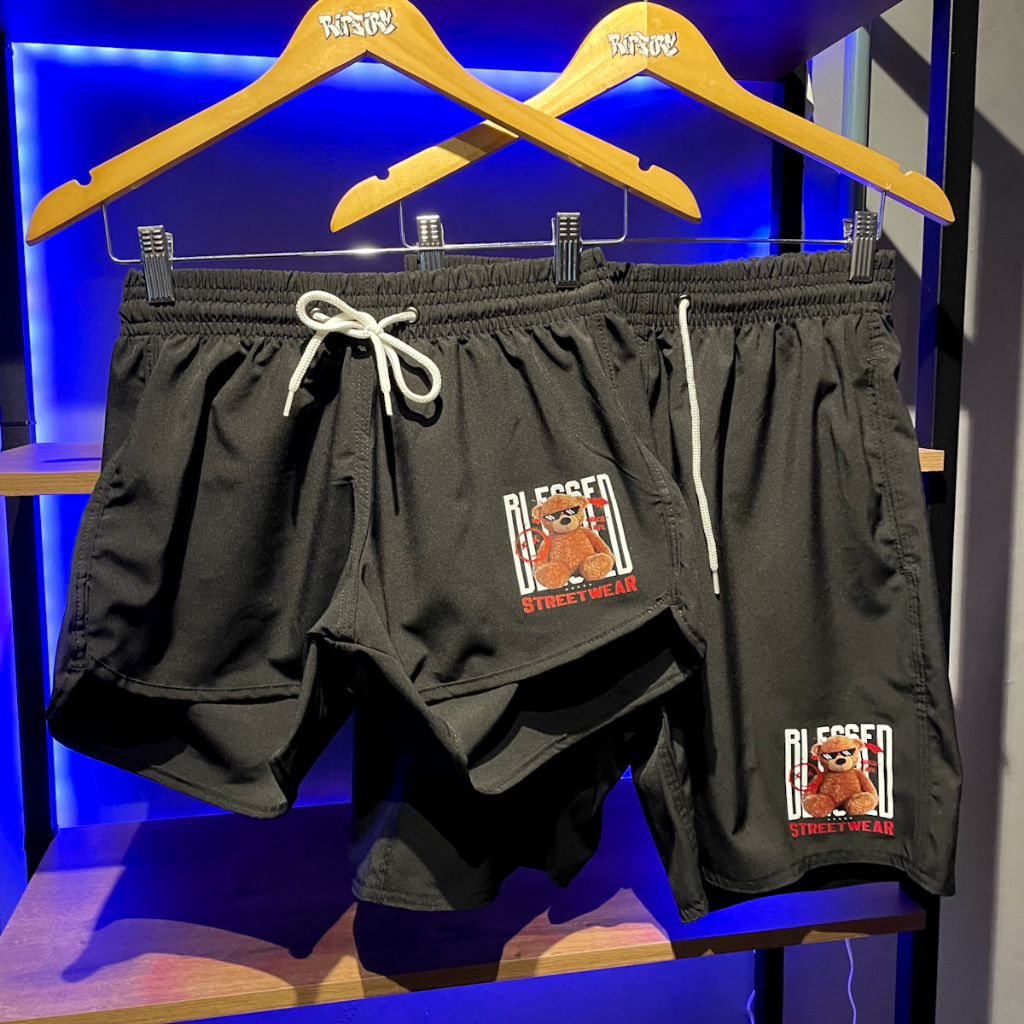Kit Casal Moda Praia Teddy Urso Thug Life Combinando Mozão Shorts Masculino e Feminino Elastano