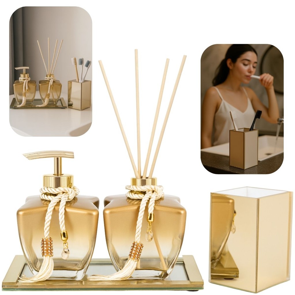 Kit Lavabo Banheiro Luxo Dourado Com Porta Escova Bandeja Difusor De Ambiente E Saboneteira