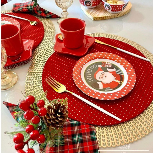 Kit 4 Peças: Capa Sousplat + MDF + Guardanapo + Argola de Madeira Completo Jogo Americano Redondo Natal Oferta