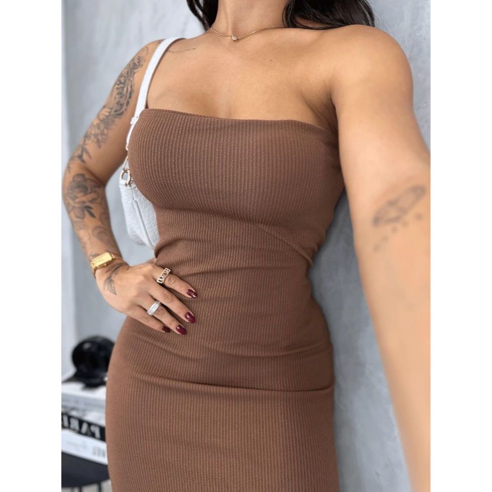 Vestido Tomara que Caia Canelado Midi com Fenda - Elegância e Ousadia