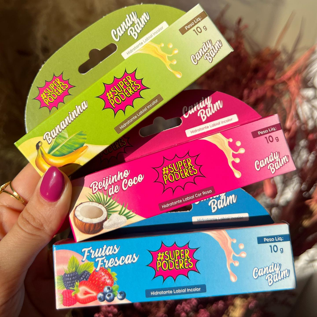 Fini Candy Lips marca Carmed Isis e Super Poderes Hidratante Labial Cheiro de Bala Lip Balm