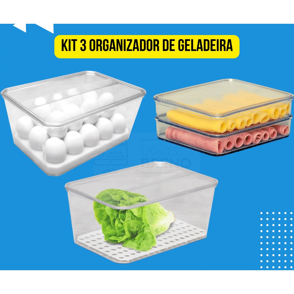 Kit 3 Organizador de Geladeira Porta Ovos Porta Frios Porta Frutas Porta Verduras