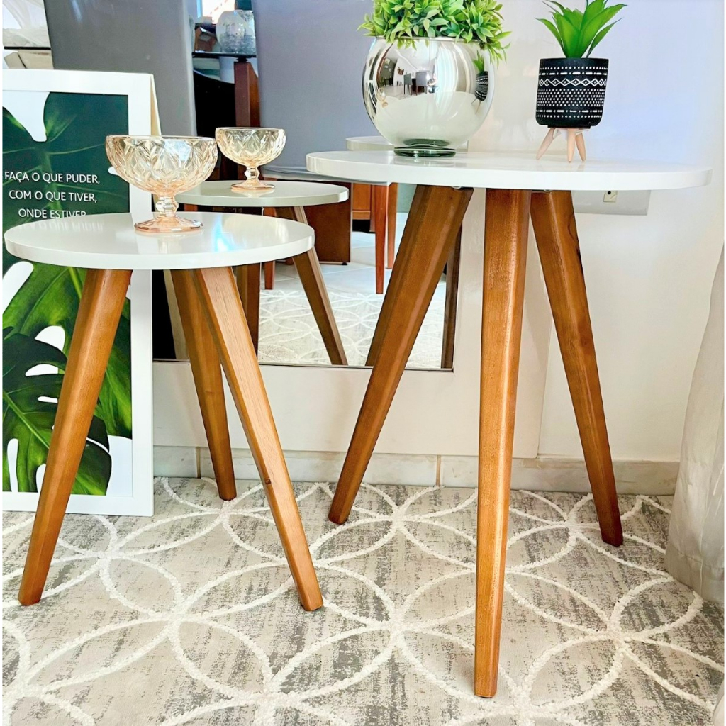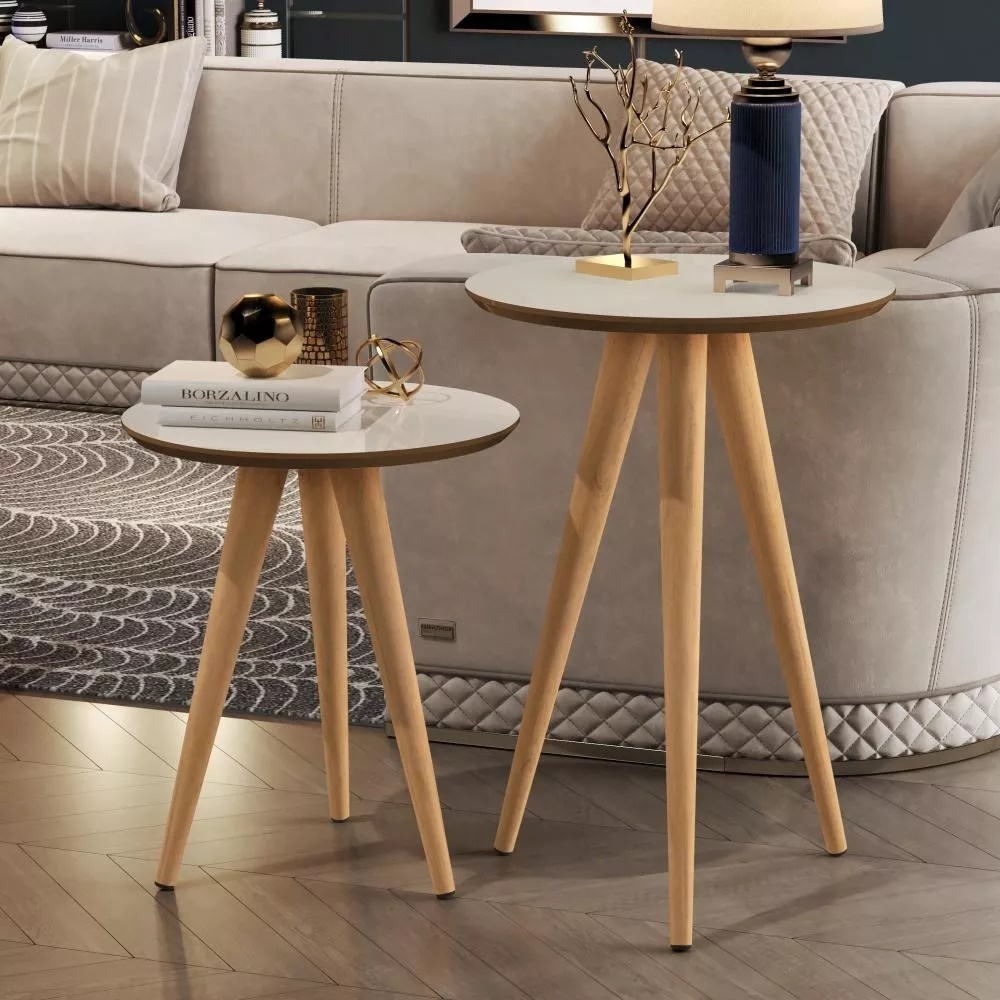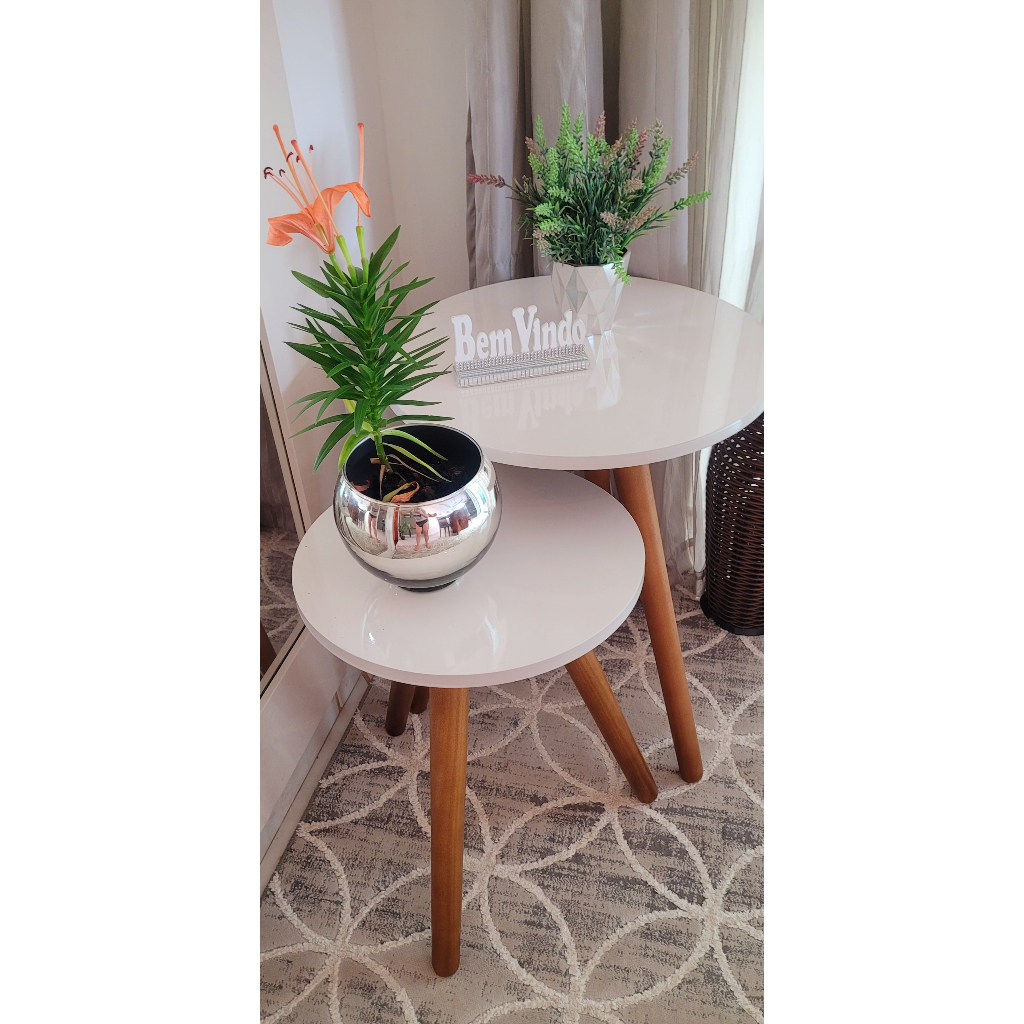 Mesa lateral redonda e canto na cor BRANCO OFF WHITE Kit com 2 unidades com 3 pé palito na cor amendoa