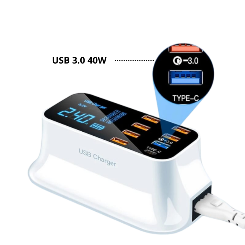 Carregador Usb Fast Charger 8 Portas Inteligente De Bancada Amperimetro Hub