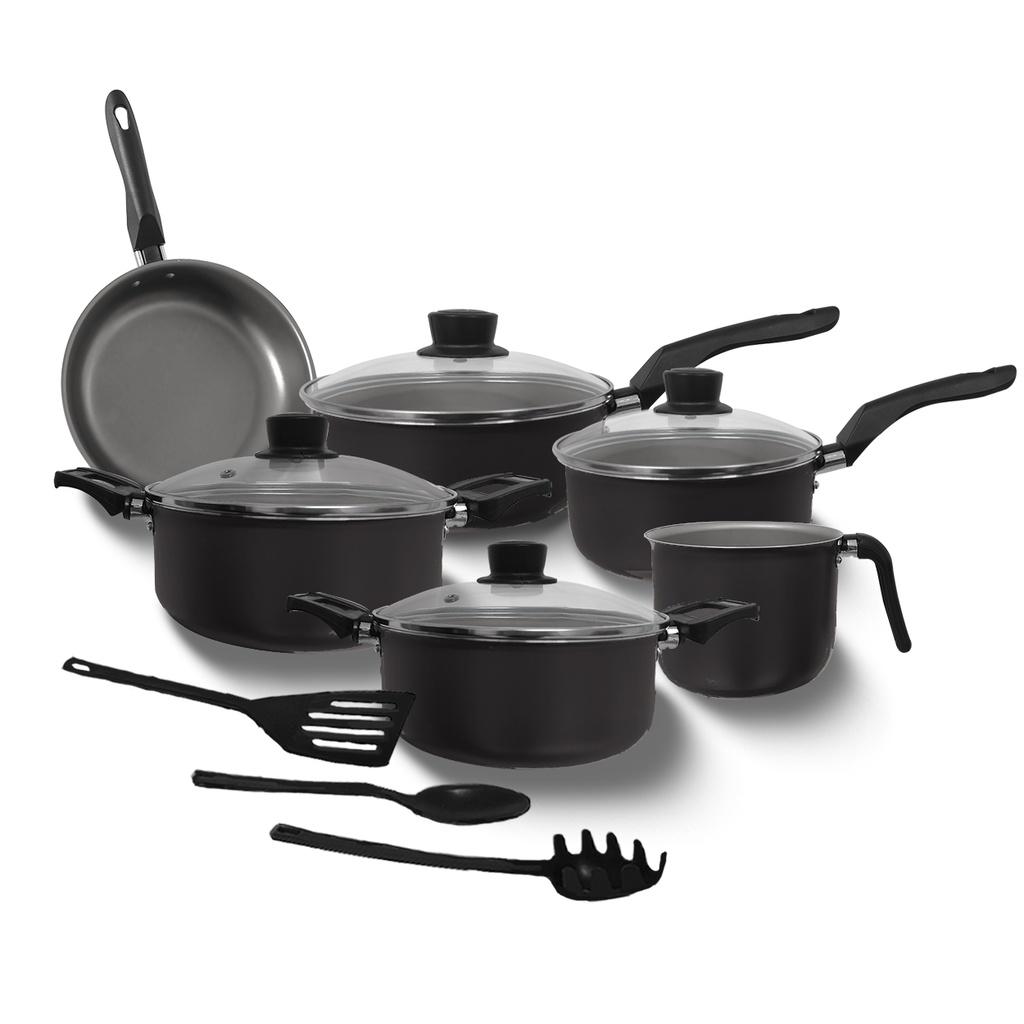 Jogo de Panelas 08 Peças Preto Panela Antiaderente Cozinha Elegan c/ Tampa de Vidro e Utensílios