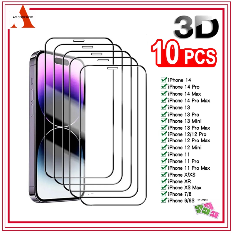 Kit 10 Película De Vidro Temperado 3D 9H Para iPhone 6/7/8 Plus Xs Xr 11 Pro Max 12 13 14 15Pro Max