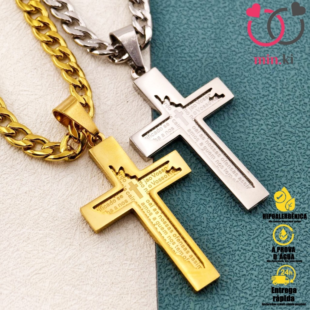 Moda Colar Masculino de Prata Corrente Grosso Elo com Pingente de Cruz e Pai Nosso em Aço Inoxidável