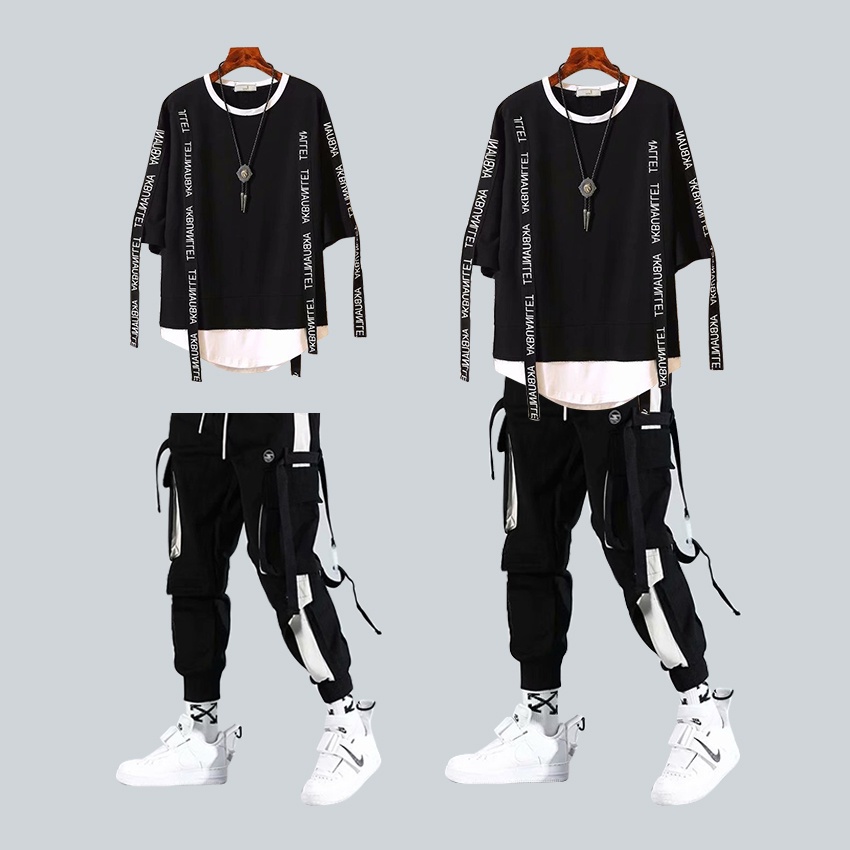 Conjunto Masculino com Camiseta de Manga Curta e Calça Cargo Estilo Hip Hop