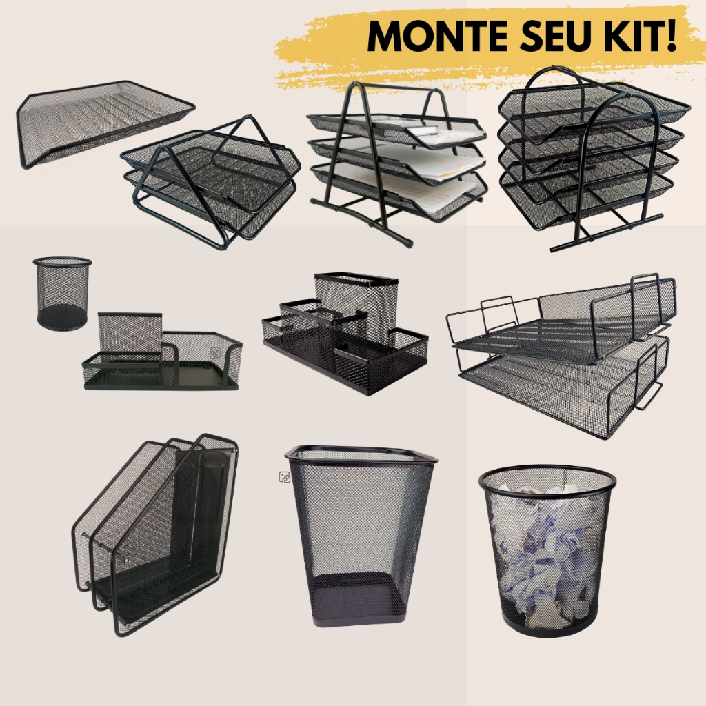 Organizador de Escritório PRETO, Lixeira Escritório Aramada 10L e 12L, Organizador de Mesa, Porta Caneta Lápis, Bandeja Organizadora Porta Papel, Arquivo Duplo Escritório Organizador para Empresa Loja Escolar Escrivaninha