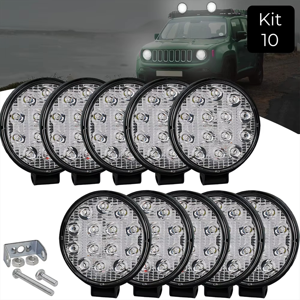 Kit 10 Farol de Led Redondo Milha Carros Jeep Caminhonete 42w 14 Leds 12v24v Revenda Fácil Instalação