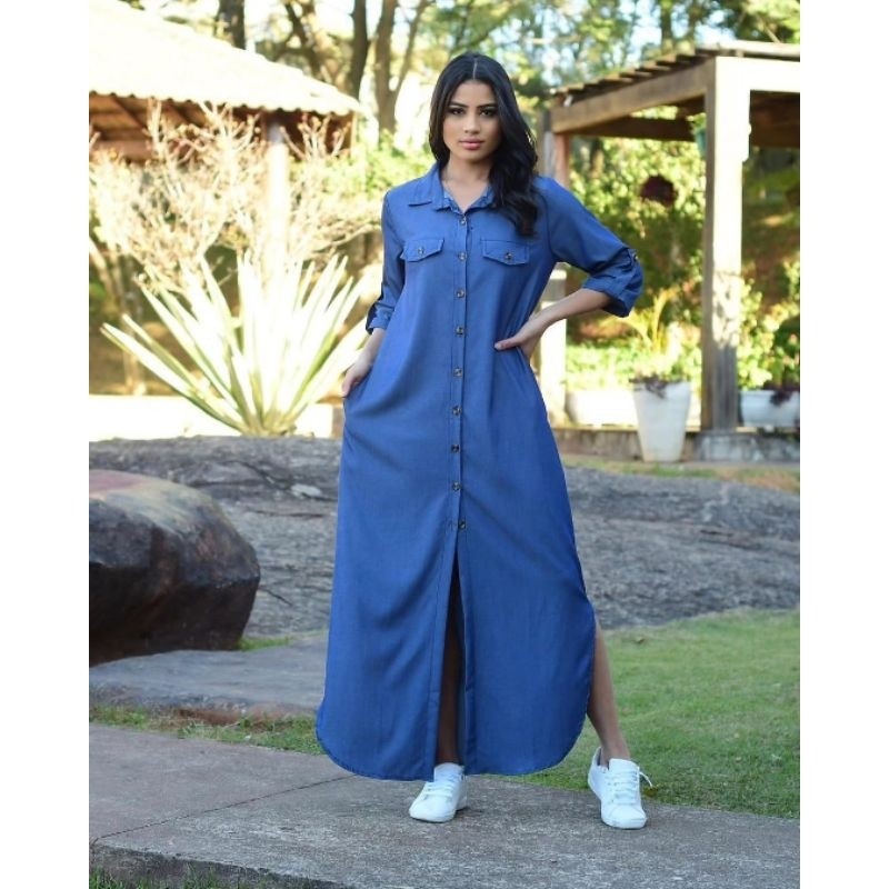 Vestido longo jeans M ao G3 plus size botões frente amamentação evangelico chamisie chemise casual e