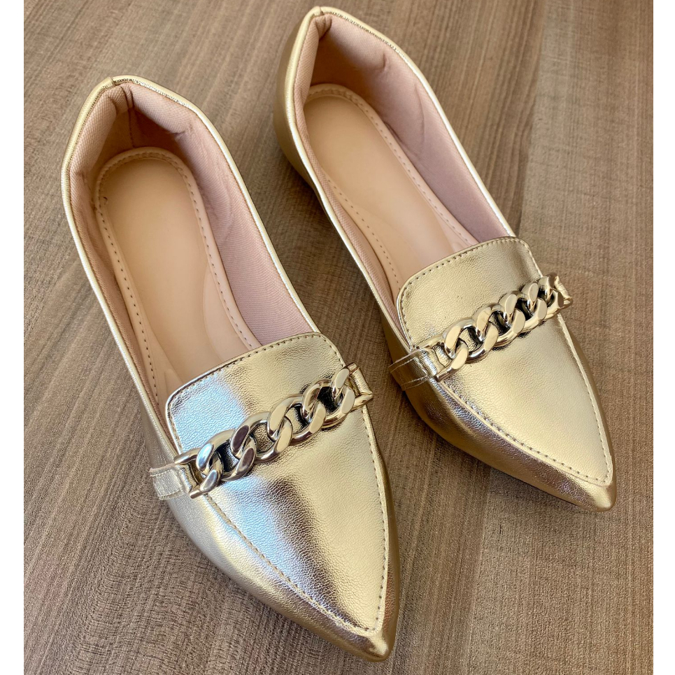 Sapatilha Mocassim Bico Fino Confort Casual Corrente Metalizado Ouro Light