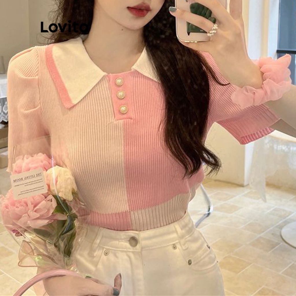 Lovito Blusas Femininas De Tricô Casual Lisas E Contrastantes Com Gola E Mangas Curtas LNA14008 (Rosa)