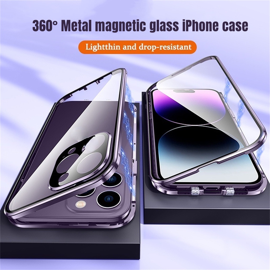 360 ° Capa De Adsorção Magnética Metálica Para iPhone 15 14 13 Pro Max Plus 11 Original De Liga Roxa Vidro Dupla Face