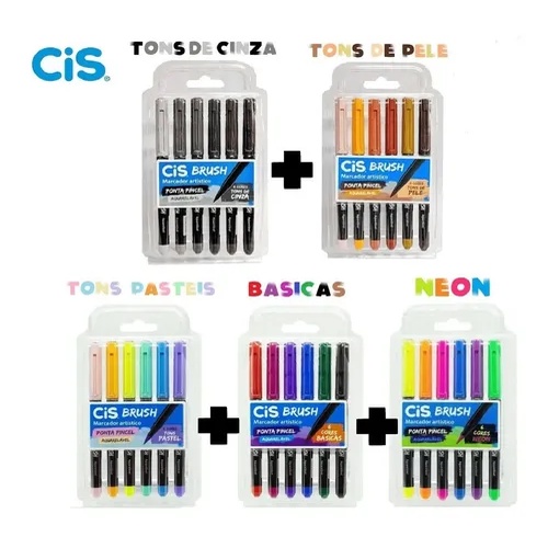 Caneta Brush Pen Cis Aquarelável com 6 cores (Neon - Tons de Cinza - Tons Pastel - Básicas ou Tons de Pele)