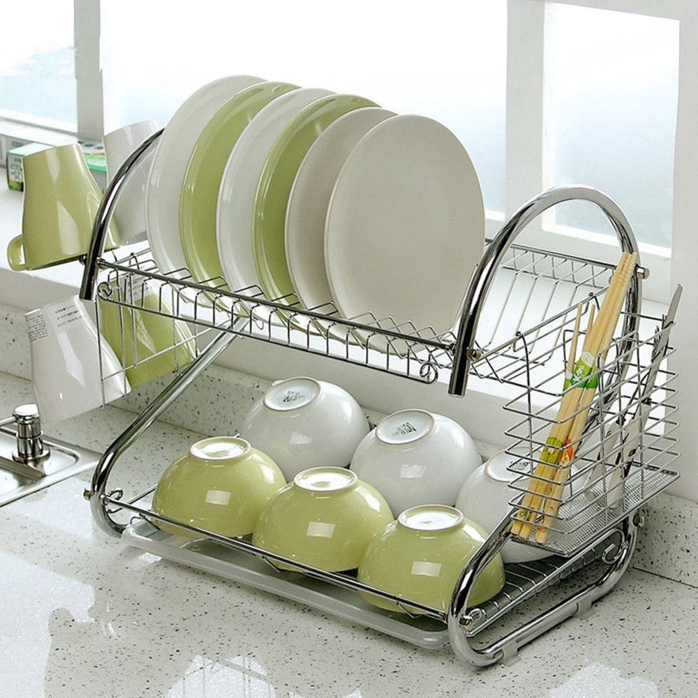Escorredor de Pia de Louças Aço Inox Cromado Com Suporte de Talher e Copos 2 Andares Porta Talheres