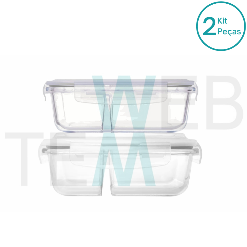 Conjunto 2 Potes Herméticos Marmita de Vidro Retangular Com Divisória 700ml e 1010ml: Organização, Sustentabilidade e Praticidade para sua Cozinha e Frescor para Alimentos
