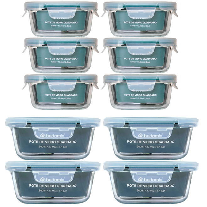 Conjunto 10 Potes de Vidro 520ml Hermético 800ml Kit Jogo Pote Tampa 4 Travas Vedação Marmita Fitness Kit