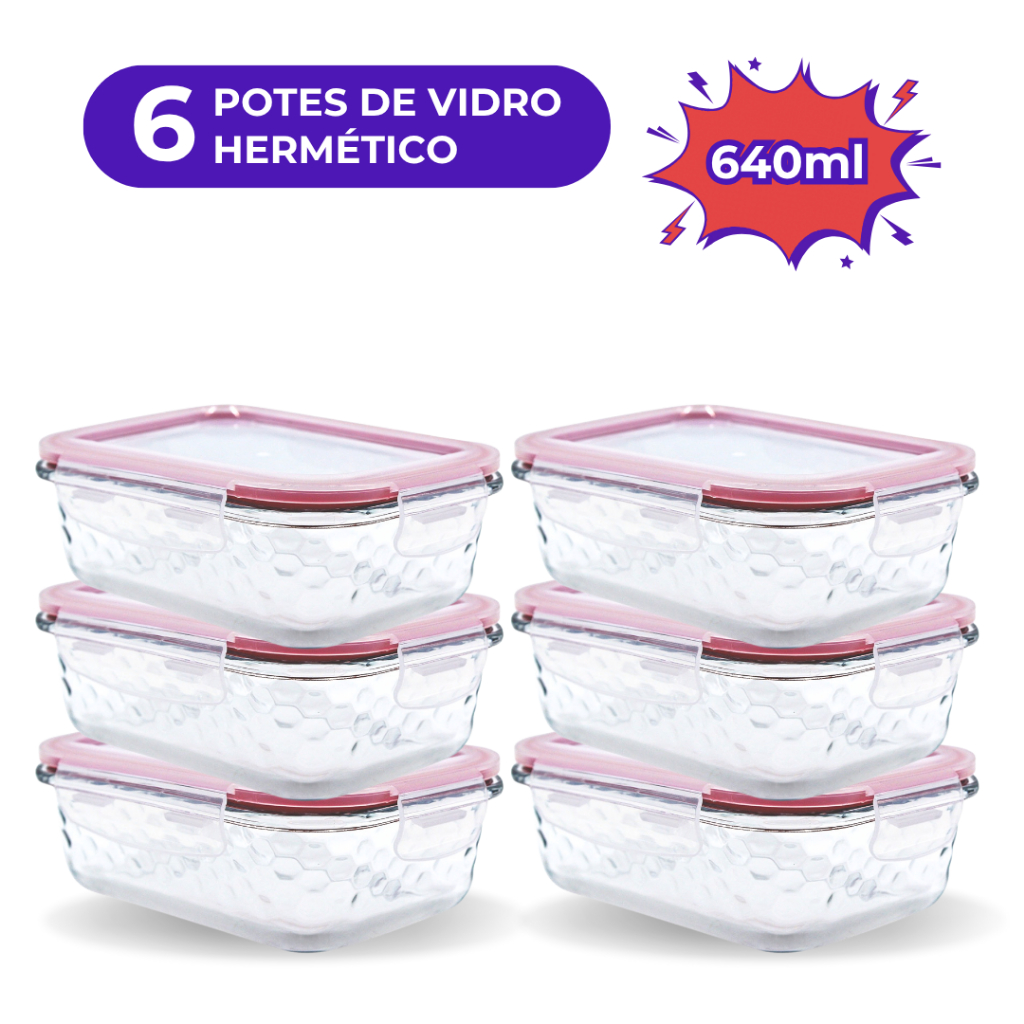 Conjunto Kit 6 Potes 640ml Vidro Hermético 4 Travas Retangular Marmita Microondas Freezer