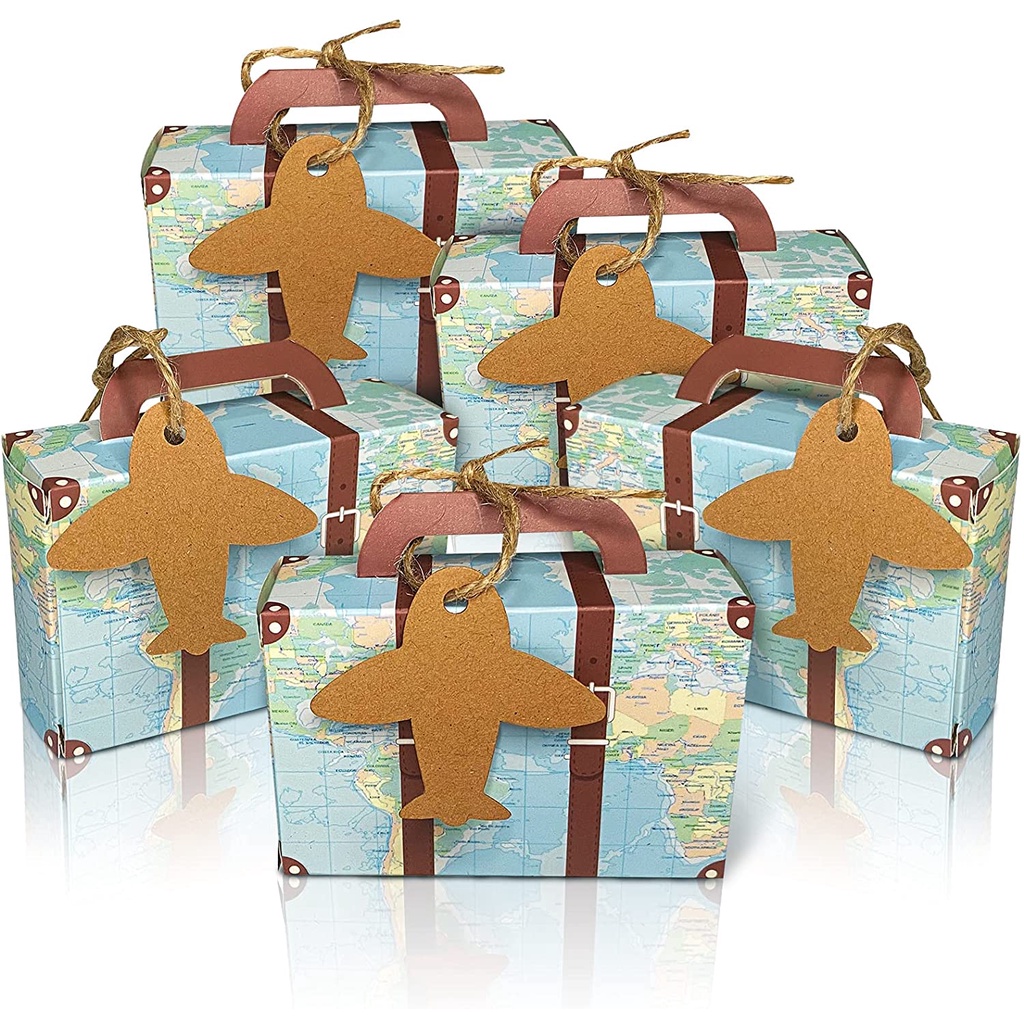 50 Pcs Favor Caixa De Doces , Mapa Do Mundo Mini Mala , Papel Kraft Vintage Com Tags E Serapilheira Gêmeoe Para Viagens Temático Festa , Chá De Noiva , Weddin