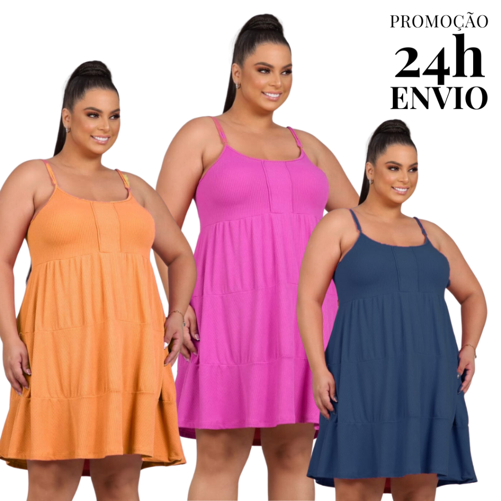Vestido Curto Canelado Plus Size - Vestidinho Plus Size de alcinha modelo soltinho